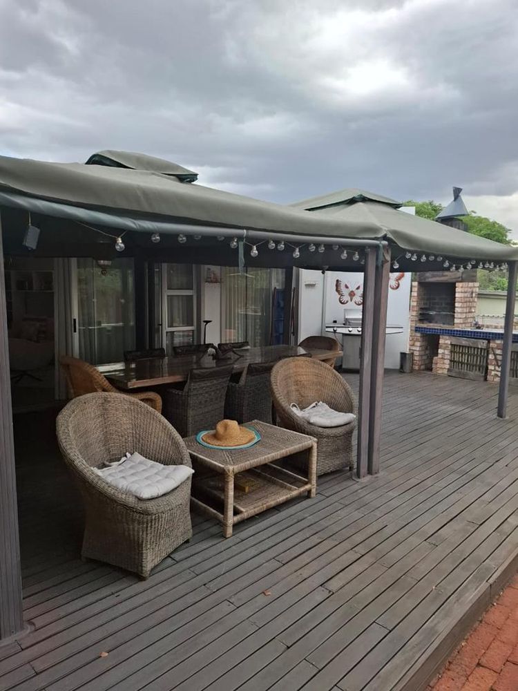 Outdoor living is equally impressive, with a swimming pool, wooden deck, paved areas, and manicured gardens — perfect for entertaining or relaxation. The property is secured with brick boundary walls, an alarm system, and a motorized entrance gate, giving peace of mind in a family-friendly environment.